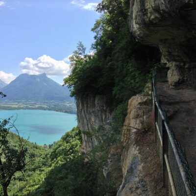 Le magnifique sentier de crête au sommet se mérite : la montée est sportive et engagée. Au gré du parcours, vous arriverez successivement au Mont Veyrier et son à pic impressionnant ; au Mont Baron, point culminant de la randonnée ; puis à l’ancien téléphérique, vestige témoignant de la fréquentation touristique du lieu lors de la Belle Époque. C’est là le plus beau panorama de la boucle, avec une vue imprenable sur le lac et les Bauges d’un côté, les Aravis et le Mont Blanc de l’autre. L’itinéraire se poursuit en descendant par le Vallon des Contrebandiers, qui vous ramènera jusqu’au port.