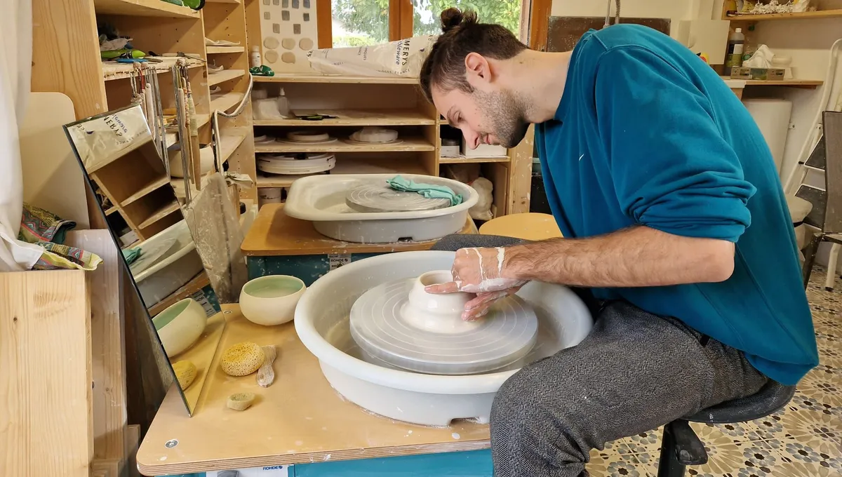 Une passion pour la peinture sur porcelaine au lycée, les Beaux-Arts à Annecy où il « touche la terre », un CAP tournage : son parcours creuse la source de son talent, évidemment. Son antre en est l’écrin. On y est bien dans son atelier, lumineux, organisé, beau, comme lui.